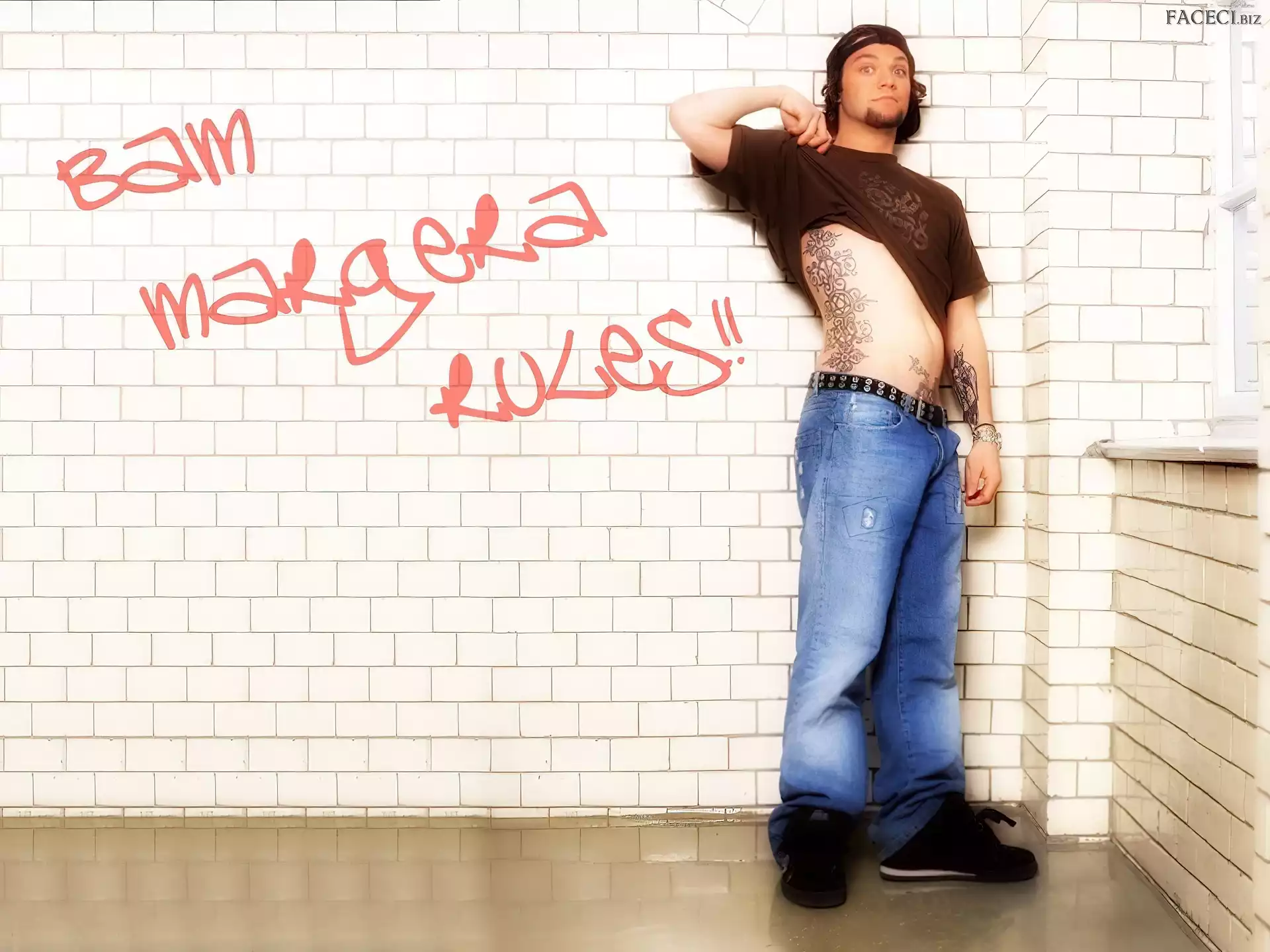 okulary, Bam Margera, butelka okulary, Bam Margera, twarze t-shirt, Bam Margera, brązowy kurtka, Bam Margera, rozpięta zegarek, Bam Margera, deskorolka włosy, Bam Margera, ciemne